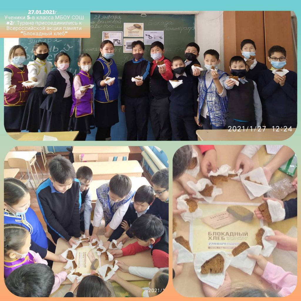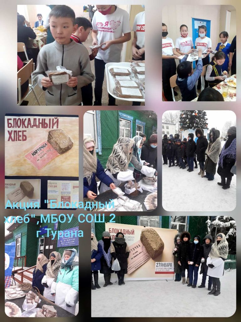 27 января волонтерами МБОУ СОШ 2 г.Турана проведена акция «Блокадный хлеб» учащимся начальной школы и населению города. Ребятам напомнили о героическом подвиге и стойкости жителей блокадного города. Предложили взять символ Акции памяти-кусочек хлеба весом 125 граммов.В акции приняли участие 15 волонтеров и 75 учащихся