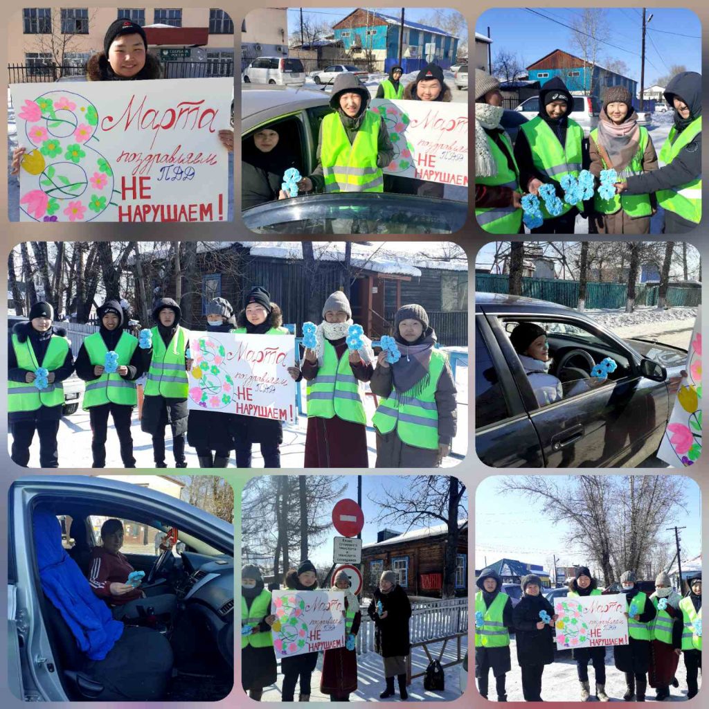 В преддверии весеннего праздника Международного женского дня, волонтёры 9в класса МБОУ СОШ 2 г.Турана провели акцию «С 8 марта поздравляем — ПДД не нарушаем!».