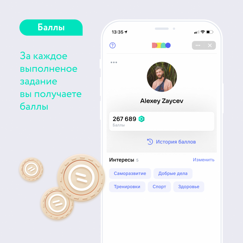 Задания направлены на всестороннее развитие, социальную активность и здоровые привычки: баллы можно заработать на занятиях спортом, чтении книг, посещении выставок, прогулках с собаками и мнооогих других видах активностей. Есть задания и для детей, поэтому можете смело привлекать их к полезным задачам, мотивируя бонусами!
