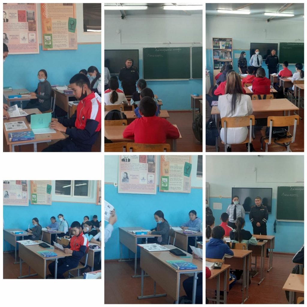19 октября 2021 года с приглашением сотрудника ИДПС ОДПС ГИБДД МО МВД России «Кызылский» старшим лейтенантом полиции Серен М.М.,ПДН ОУУП и ПДН7 (г.Туран) МО МВД России «Кызылский» и майором полиции Сырат М.С. проведена профилактическая лекция, беседа на тему: «ПДД в период проведения осенних каникул», «Осторожно, карманник», «Как сохранить свой сотовый телефон»,»Памятка по сохранности имущества для обучающих», «Мои права и обязанности»