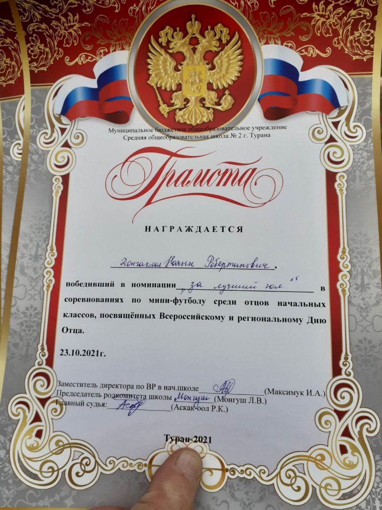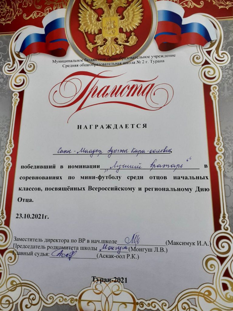 23 октября с целю популяризации футбола среди отцов детей начальной школы был проведён мини-футбол посвященный всероссийскому и региональному дню отца. Играли две команды и участники отмечены в номинациях: » Лучший нападающий»,» Лучший вратарь», «Лучший защитник», «За лучший гол». Чашпан-оол С.А., Саны-Маадыр А.К.,Шимээлге А.И.,Донгак-оол Н.Р., Сандакпан А.Ч.,Чыргал Д.,Хунажик Н.С.,Анчи А.Р.