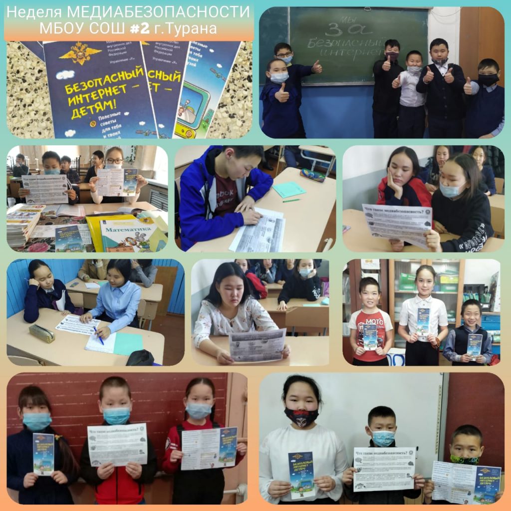 Во исполнение плана воспитательной работы МБОУ СОШ #2 г. Турана на 2020-2021 учебный год, в период с 14.01.2021г. по 19.01.2021г. среди учащихся 1-11 классов школы, совместно с классными руководителями, проведены информационные пятиминутки, в ходе которых до учащихся была доведена информация о соблюдении мер безопасности при выходе в сеть Интернет. Кроме того, среди учащихся были распространены информационные буклеты по медиабезопасности.